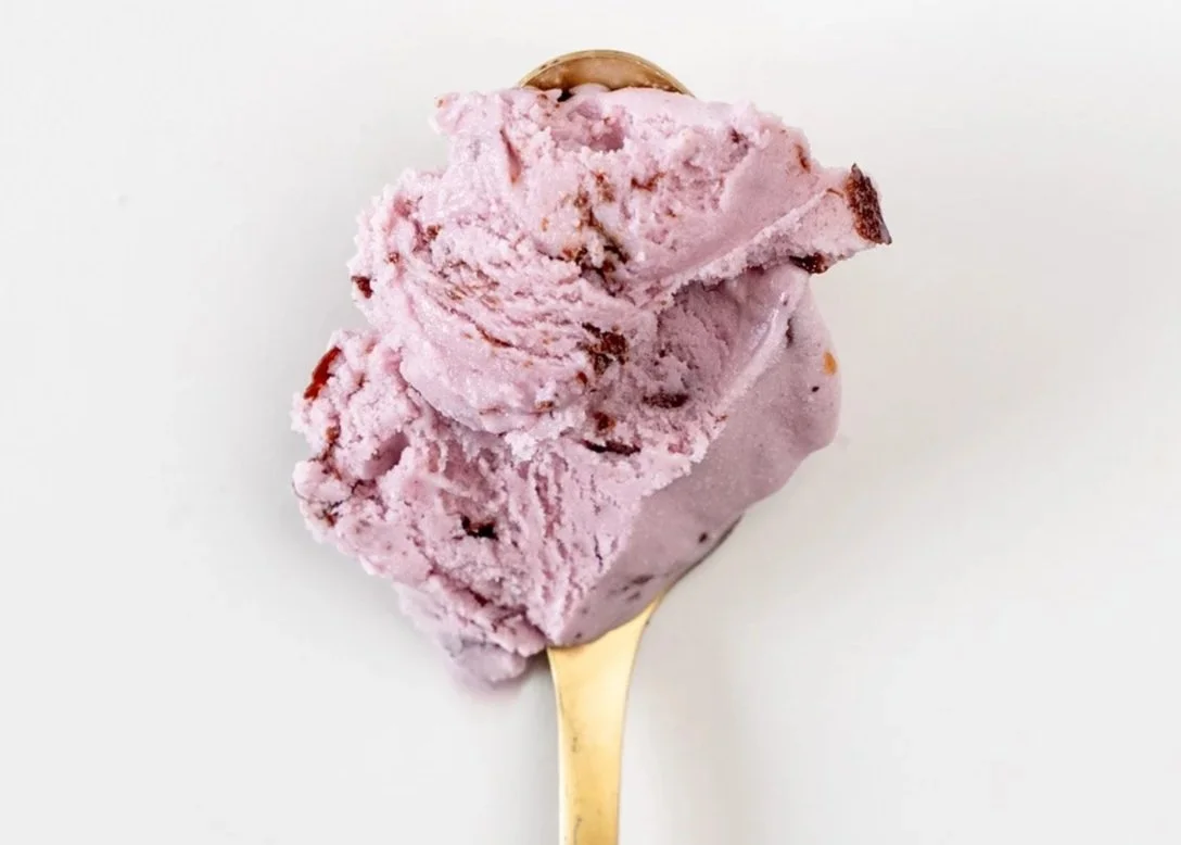A blackberry ice cream spun with semi-sweet chocolate chips (S)