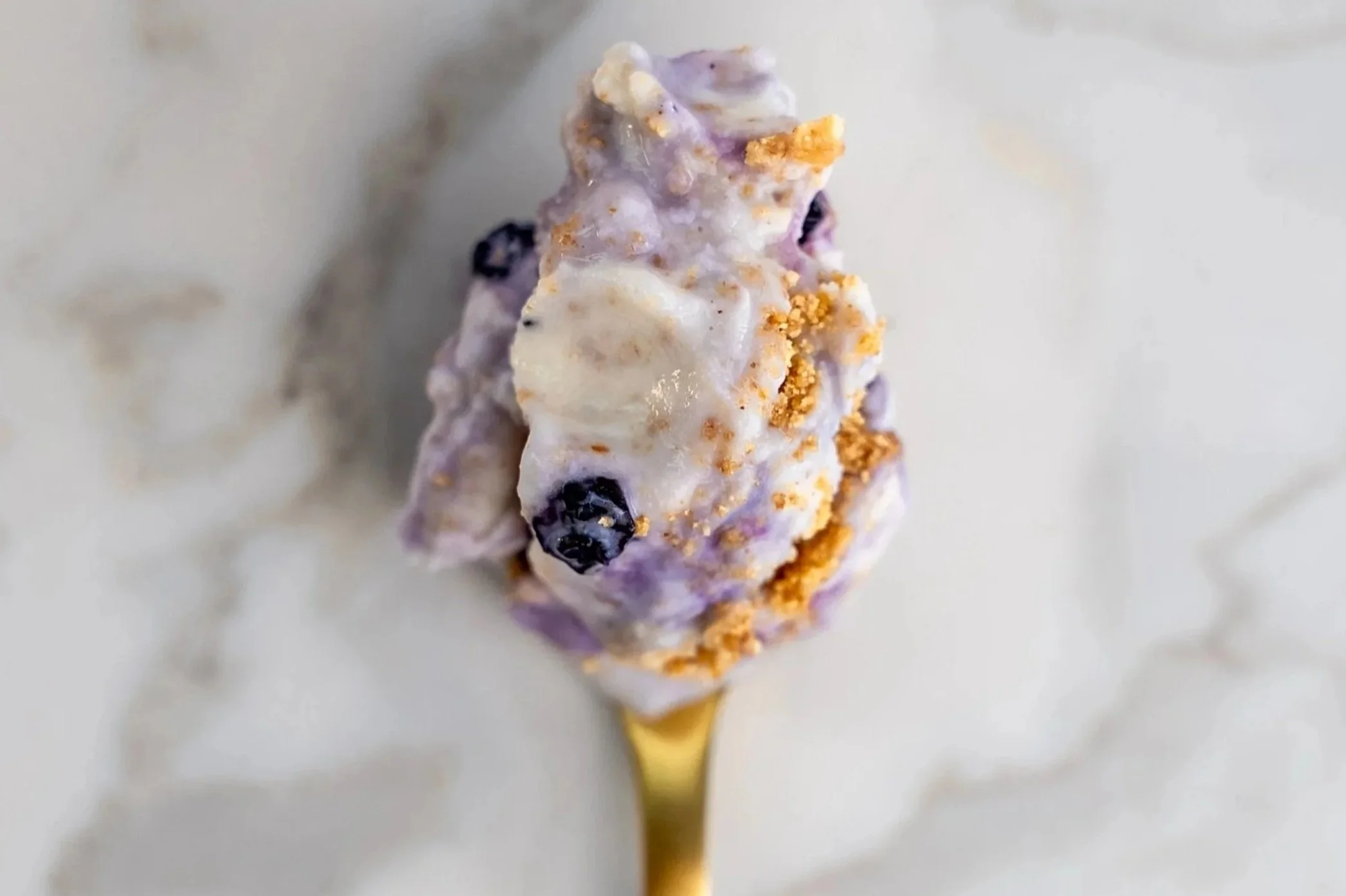 Blueberry ice cream with buttery chunks of graham cracker crust and swirls of cream cheese filling (G,S,E)